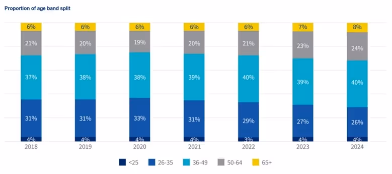 Buyers in the 26-35 age group accounted for 31% of total purchases in 2018, and this fell to 27% in 2023 (see graph: Proportion of age band split).